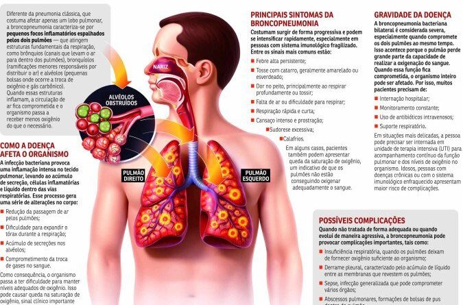 No hospital, passa por tomografia de tórax, exames laboratoriais e avaliação clínica detalhada. A equipe identifica broncopneumonia bilateral, inflamação infecciosa que atinge os dois pulmões e compromete a respiração. Os médicos iniciam imediatamente o tratamento com dois antibióticos intravenosos e monitoramento contínuo na UTI.