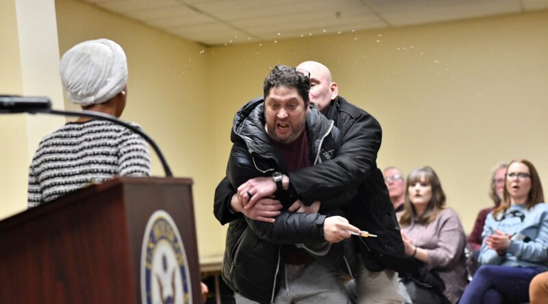 A deputada democrata Ilhan Omar é atacada com um líquido lançado por seringa durante um discurso público em Minneapolis, na noite de 28 de janeiro de 2026. O agressor é contido por seguranças e por pessoas da plateia, e o episódio reacende o alerta sobre violência política nos Estados Unidos.