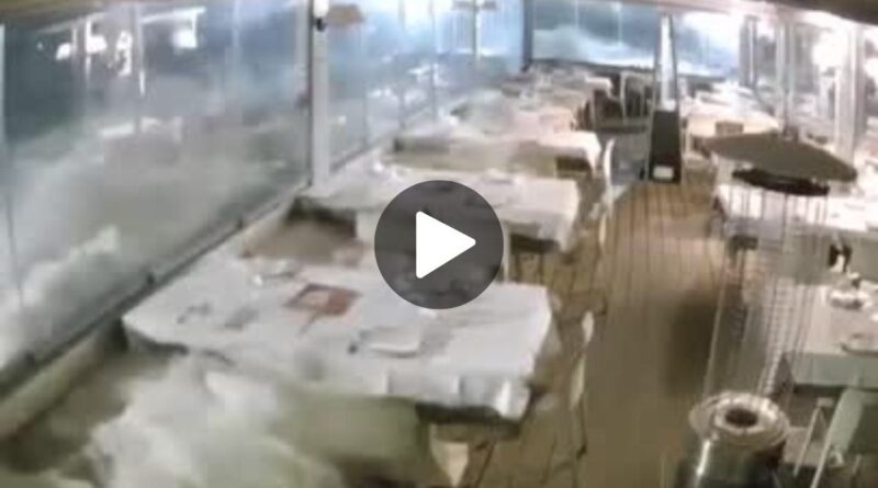 Funcionários gritam para que clientes se afastem das janelas enquanto tentam desligar equipamentos elétricos e proteger o caixa. Em cerca de 30 segundos, o que era um ambiente de almoço à beira-mar vira cenário de destruição, com garrafas quebradas, pratos boiando e uma lâmina de água barrenta cobrindo todo o piso.