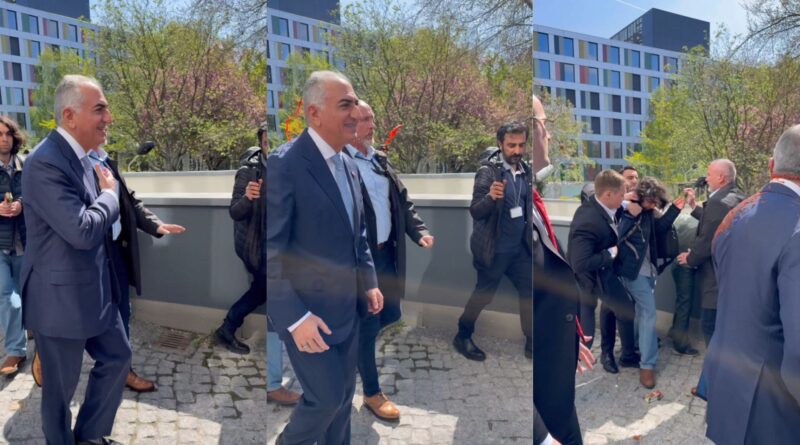 Pahlavi desce de um carro oficial pouco antes das 11h, em um centro de conferências na capital alemã, quando um homem se aproxima por trás e arremessa tinta escura em suas costas. A reação é imediata: seguranças cercam o príncipe, um agente tenta cobrir a mancha com o próprio corpo e policiais alemães imobilizam o suspeito em questão de segundos, a poucos metros da entrada principal.