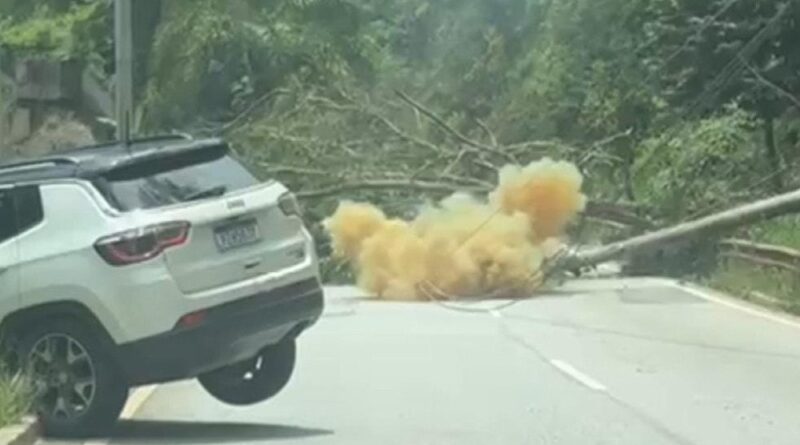 Imagens enviadas por motoristas ao jornal registram o momento em que a estrutura cede e atinge o asfalto. No vídeo, o poste quebra, cai sobre a via e provoca uma pequena explosão, seguida de fumaça. Um carro aparece atravessado no acostamento, com a frente voltada para o barranco, como se o motorista tivesse tentado fugir da queda.