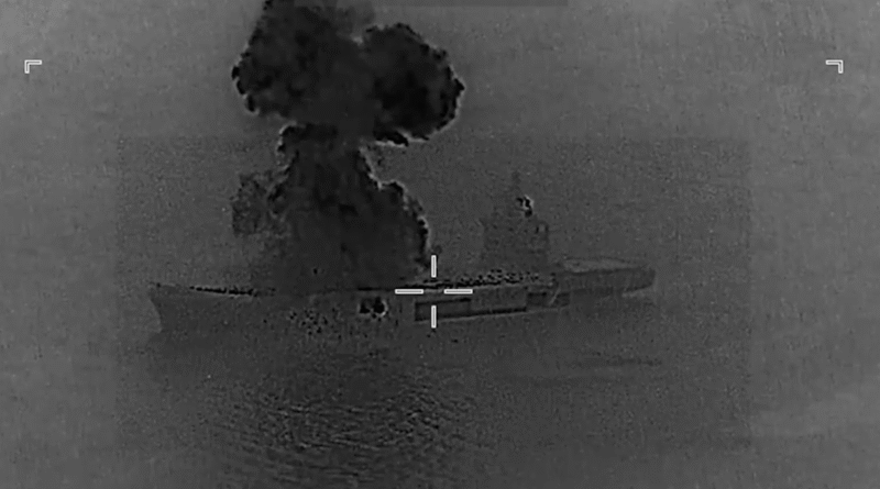 O vídeo, publicado na rede social X, mostra a embarcação enquadrada por uma mira eletrônica, semelhante às usadas em sistemas de armamento de alta precisão. Um clarão corta a tela, o impacto atinge o navio e, em poucos segundos, o casco passa a ser engolido por chamas intensas. A Marinha americana não informa o local exato do ataque, apenas que ocorre em uma área estratégica do Oriente Médio, zona de operações do Irã e de forças ocidentais.